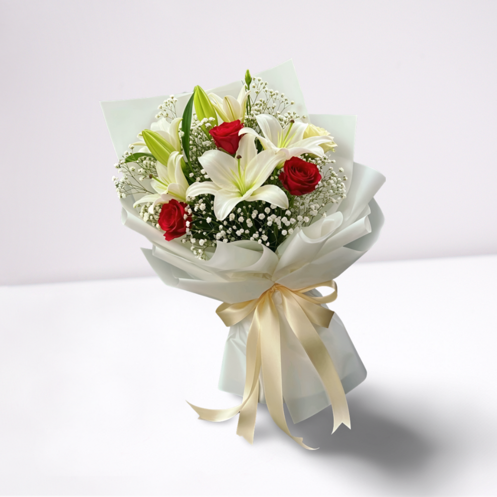 2 tiges de lys élégantes + 3 roses rouges éclatantes, le tout enveloppé de gypsophile douce et vaporeuse.