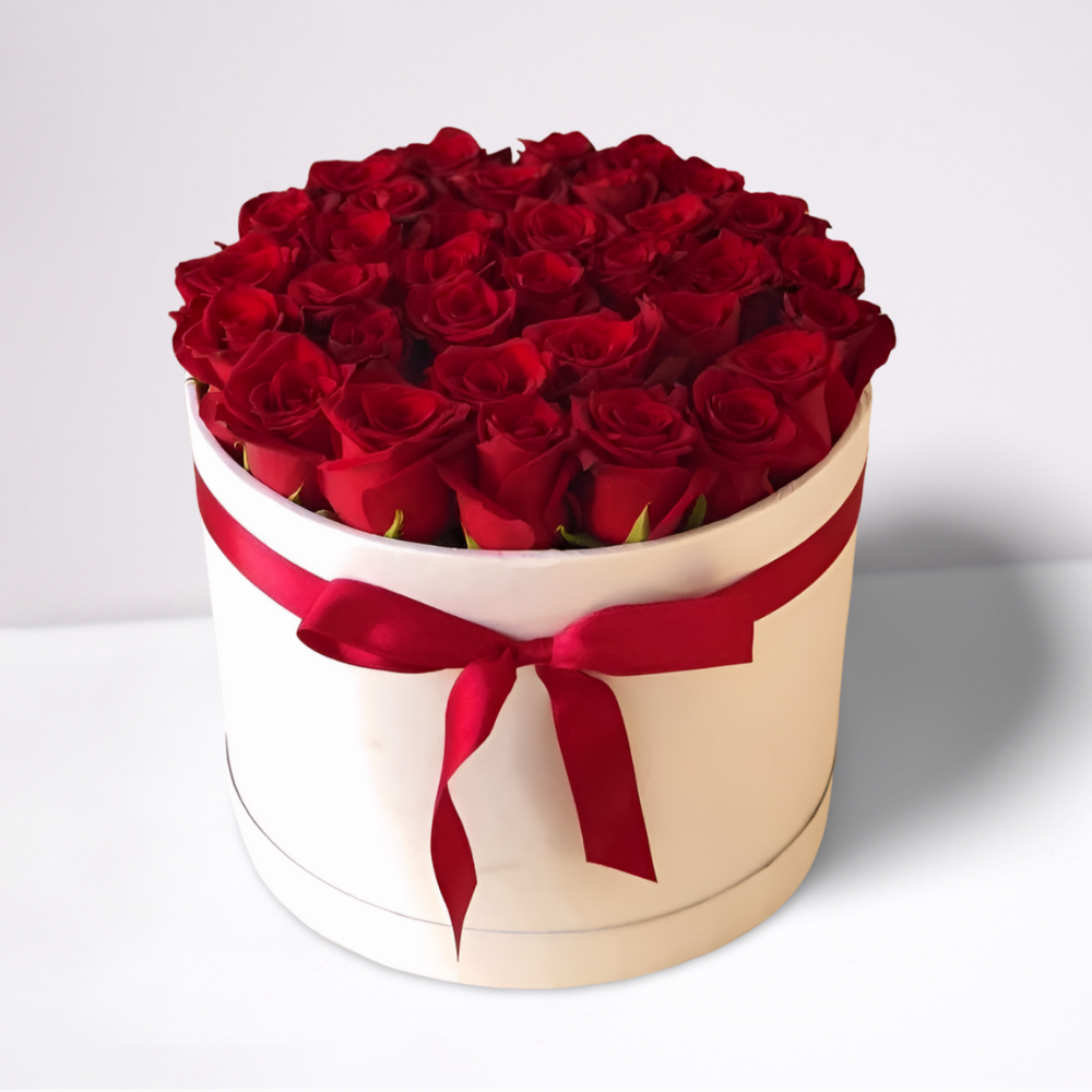 Trente roses rouges étincellent de leur écrin blanc immaculé,